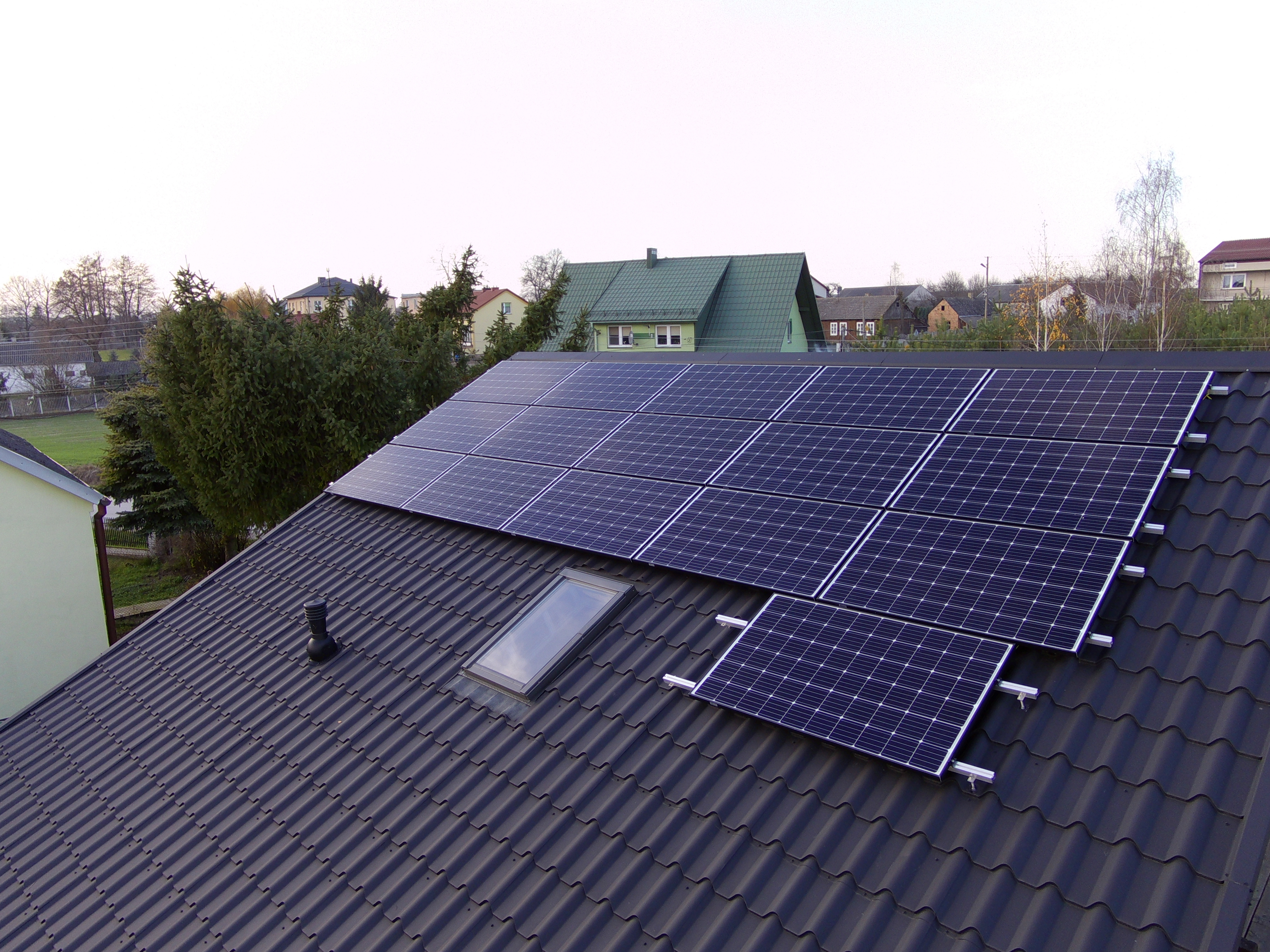 Instalacja fotowoltaiczna o mocy 6,3 kW zamontowana na dachu skośnym, przykrytym blachodachówką .