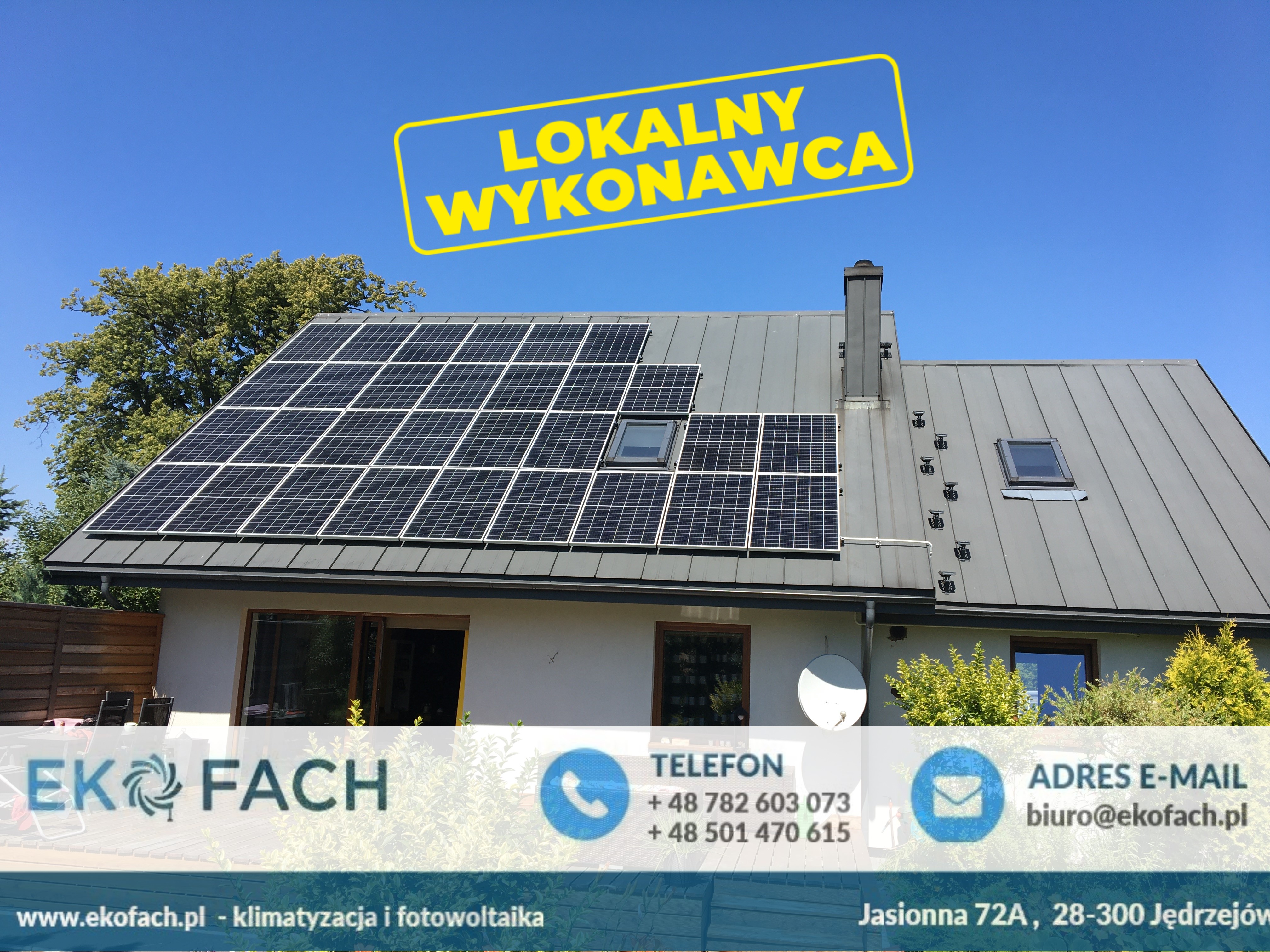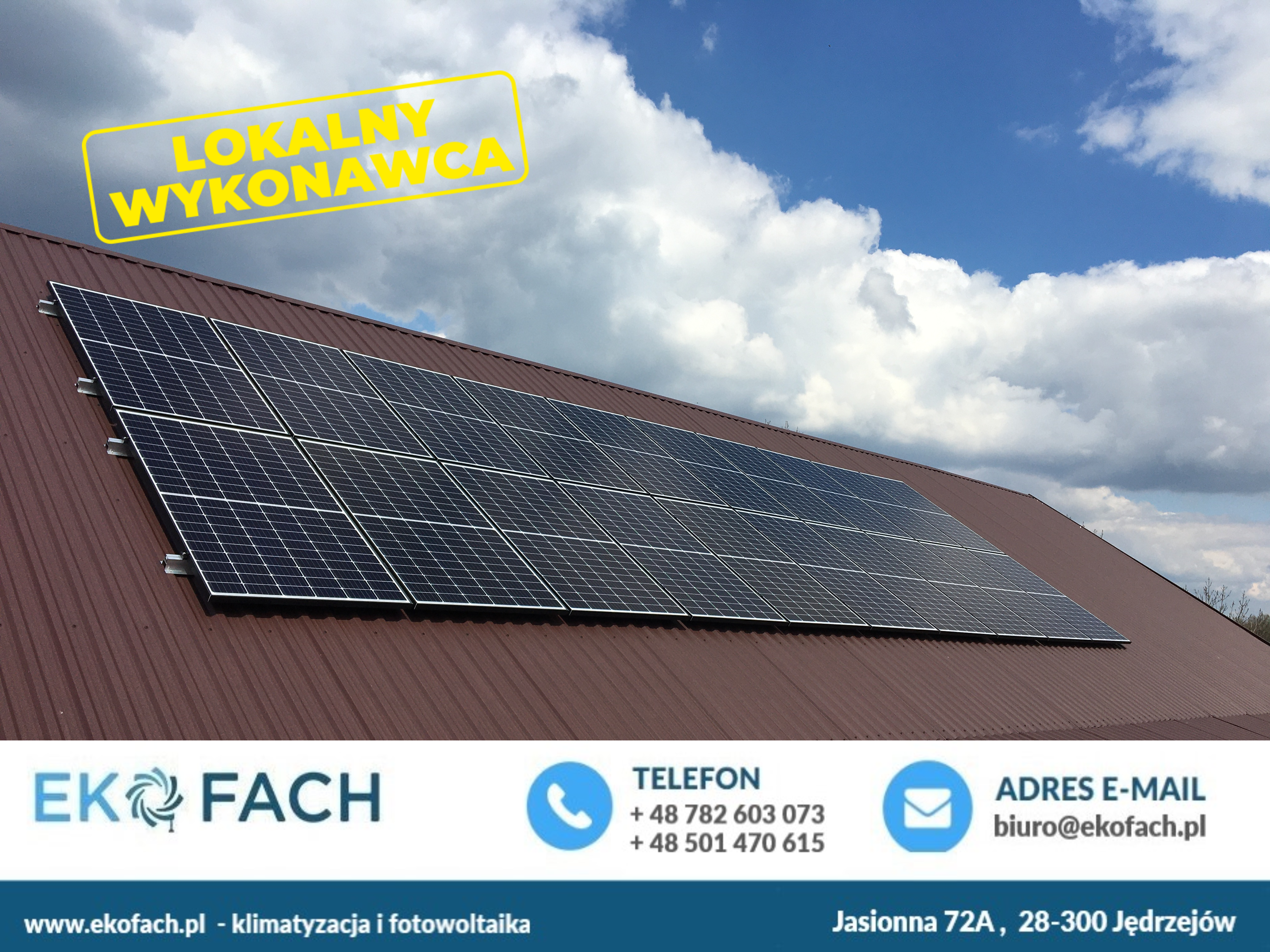 Instalacja fotowoltaiczna o mocy 9,9 kWp zamontowana na dachu skośnym pokrytym blachą na rąbek stojący .