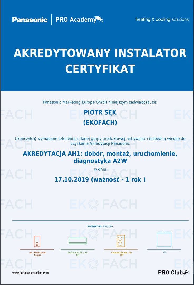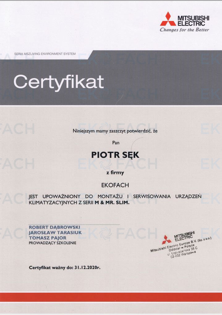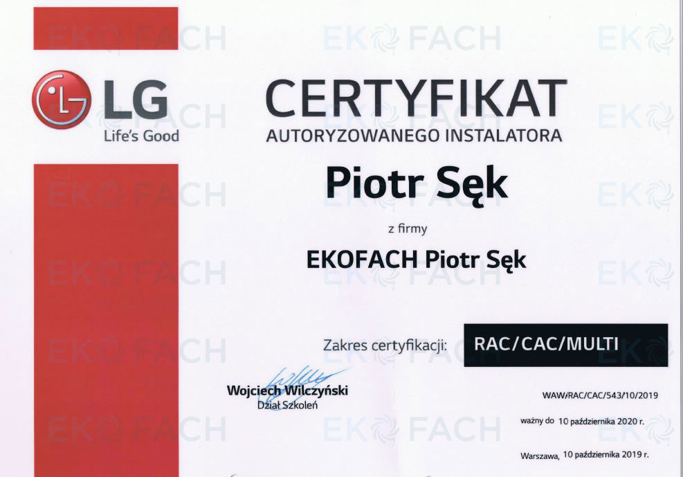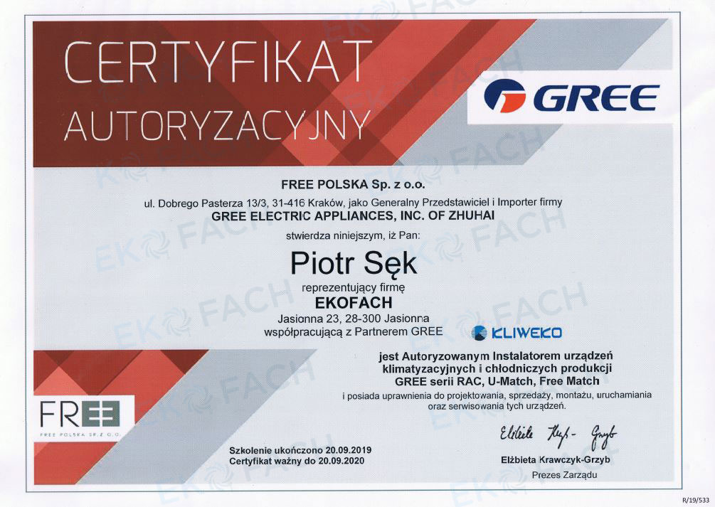 Firma EKOFACH posiada certyfikat Urzędu Dozoru Technicznego oraz jest autoryzowanym instalatorem firm GRRE, LG , MISTUBISHI, PANASONIC